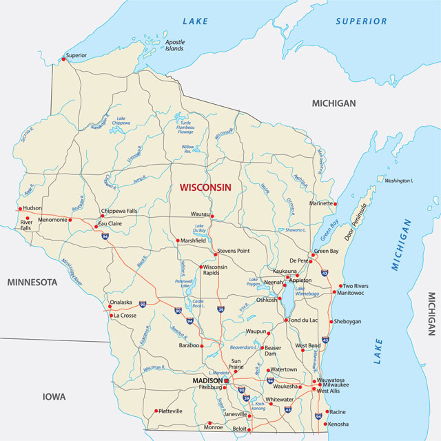 Northern Wisconsin has one of the largest concentrations of lakes in the world. There are nearly 15,000 inland lakes of more than 20 acres (8 hectares) in size. The largest is Lake Winnebago (215 square miles/550 square km) in the Fox River valley. Wisconsin also includes 7,387 square miles (19,132 square km) of Lake Michigan and 2,675 square miles (6,928 square km) of Lake Superior. The Mississippi River flows along the lower half of Wisconsin’s western border for about 230 miles (370 km). There are also thousands of streams throughout the state.