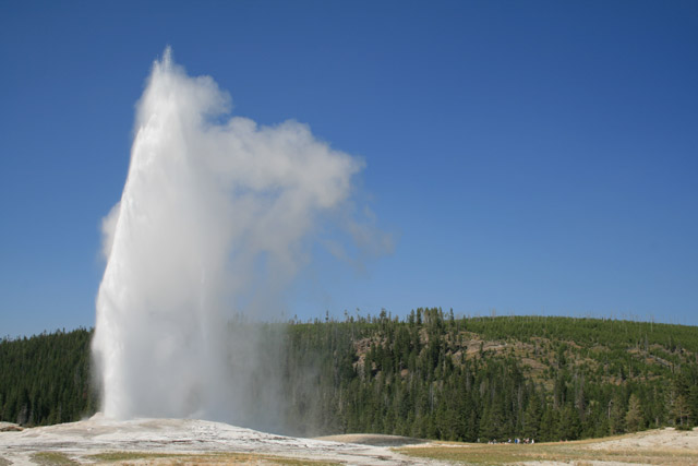 Yellowstone is over a supervolcano which is not currently erupting, but whose heat is responsible for the geysers all over the park. Half of the world's geysers are in Yellowstone, including the most famous geyser in the world, called Old Faithful, which erupts at just under an hour interval. It is a major tourist attraction.