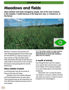 Meadows are places where grasses and other flowering plants thrive, but where trees are rare (picture ). Natural meadows are only common on high mountains where trees cannot grow. But they are also found in valley bottoms where farmers have cut down the trees to make grazing land for animals (picture ).
