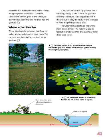 Water lilies have large leaves that float on water. Many garden ponds have them. You can also see them in the ponds at parks (picture ).