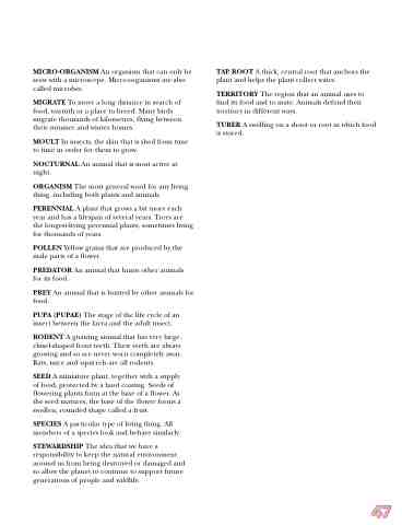 mIgrAtE To move a long distance in search of food, warmth or a place to breed. Many birds migrate thousands of kilometres, flying between their summer and winter homes.