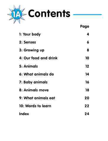 Page 1: Your body 4 2: Senses 6 3: Growing up 8 4: Our food and drink 10 5: Animals 12 6: What animals do 14 7: Baby animals 16 8: Animals move 18 9: What animals eat 20 10: Words to learn 22 Index 24