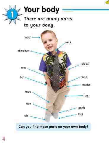 1 10 head shoulder arm hip knee shin toe neck Your body There are many parts to your body. elbow hand thumb leg ankle foot 4 Can you find these parts on your own body?