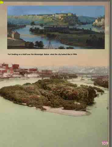 Fort Snelling on a bluff over the Mississippi. Below: what the city looked like in 1906. 109