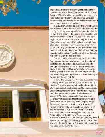 to get away from the modern world and do their own work in peace. The most famous of these was Georgia O’Keeffe, although, seeking seclusion, she lived outside of the city. The creatives were also fascinated by the Pueblo Indian pottery and helped to develop it into a craft industry.