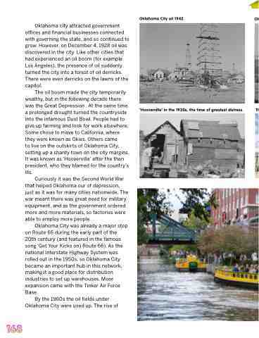 The oil boom made the city temporarily wealthy, but in the following decade there was the Great Depression . At the same time a prolonged drought turned the countryside into the infamous Dust Bowl. People had to give up farming and look for work elsewhere. Some chose to move to California, where they were known as Okies. Others came