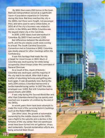 By 1816, there were 250 homes in the town. Railroad transportation served as a significant cause of population expansion in Columbia during this time. Rail lines reached the city in the 1840s, but these were freight, not passenger lines, and were used to carry cotton bales. In 1850 all of the city’s business was related to cotton. In the 1850s and 1860s Columbia was the largest inland city in the Carolinas.