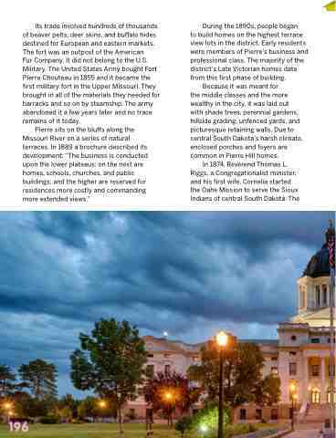 to build homes on the highest terrace view lots in the district. Early residents were members of Pierre’s business and professional class. The majority of the district’s Late Victorian homes date from this first phase of building.