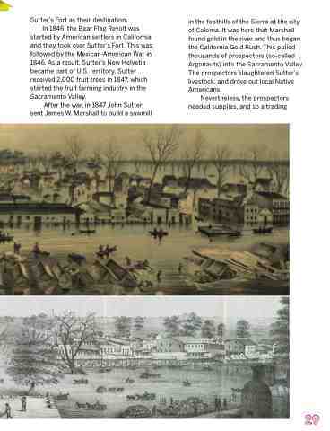 in the foothills of the Sierra at the city of Coloma. It was here that Marshall found gold in the river and thus began the California Gold Rush. This pulled thousands of prospectors (so-called Argonauts) into the Sacramento Valley. The prospectors slaughtered Sutter’s livestock, and drove out local Native Americans.