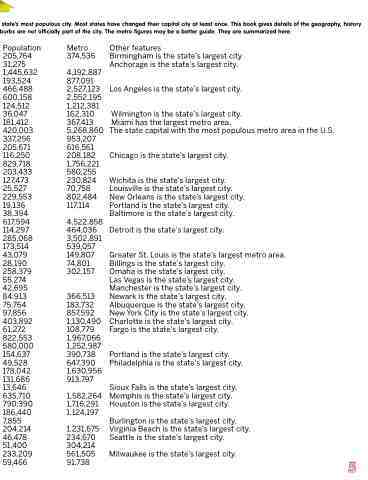 state’s most populous city. Most states have changed their capital city at least once. This book gives details of the geography, history burbs are not officially part of the city. The metro figures may be a better guide. They are summarized here.