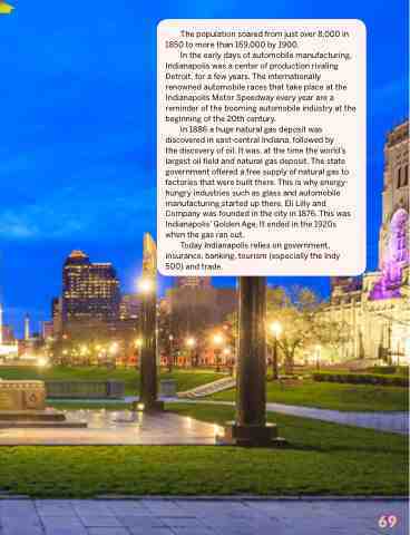the discovery of oil. It was, at the time the world’s largest oil field and natural gas deposit. The state government offered a free supply of natural gas to factories that were built there. This is why energy- hungry industries such as glass and automobile manufacturing started up there. Eli Lilly and Company was founded in the city in 1876. This was Indianapolis’ Golden Age. It ended in the 1920s when the gas ran out.