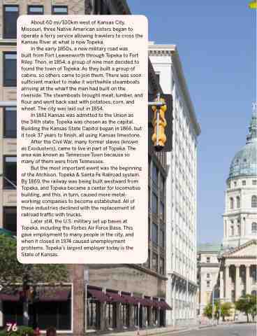 Later still, the U.S. military set up bases at Topeka, including the Forbes Air Force Base. This gave employment to many people in the city, and when it closed in 1974 caused unemployment problems. Topeka’s largest employer today is the State of Kansas.
